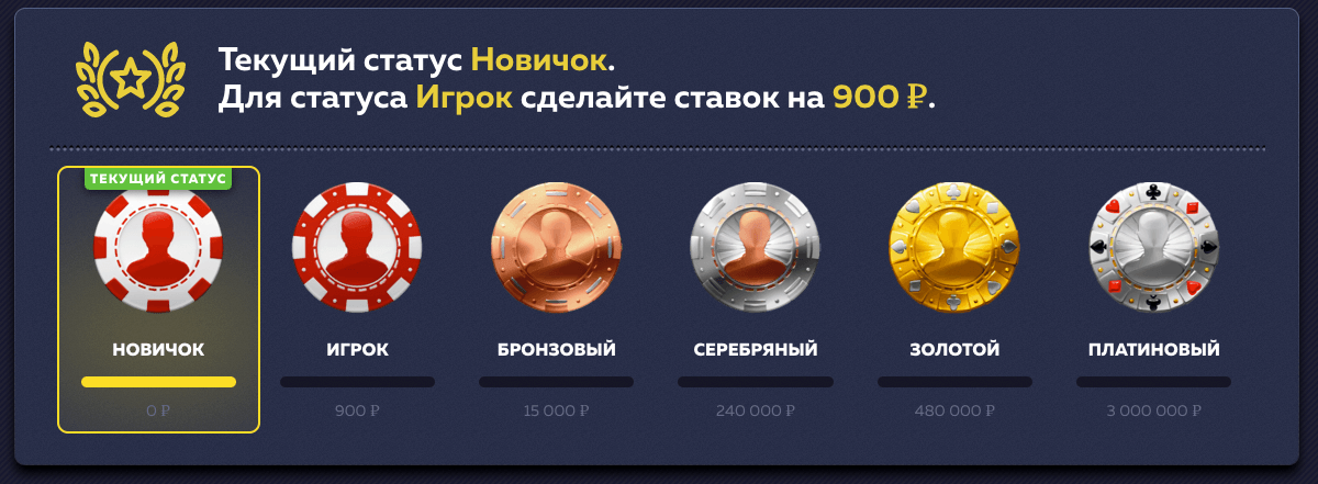 Сразу же при регистрации игроку присуждается статус «Новичок», далее начав игру в казино вы буквального с первого депозита сделая ставок на 900 рублей подниметесь до уровня «Игрок».